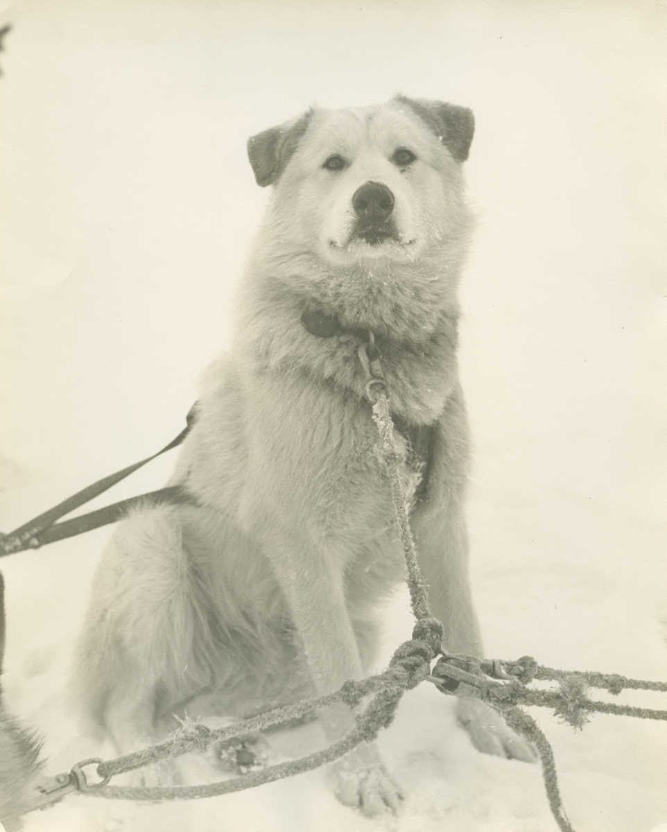 Fotografi från låda märkt Bernt Balchen. Balchen var norsk-amerikansk flygare, polarforskare och militär. Porträtt av en polarhund i snön.
