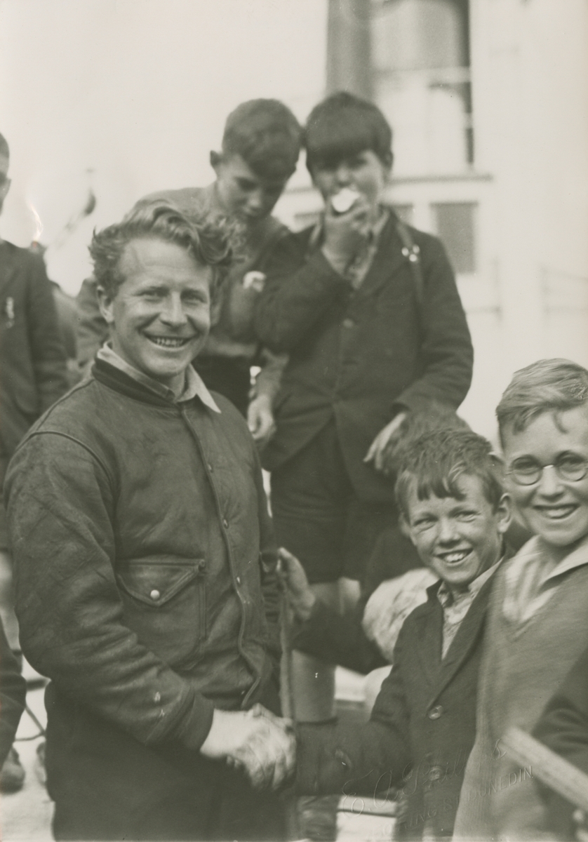 Fotografi från låda märkt Bernt Balchen. Balchen var norsk-amerikansk flygare, polarforskare och militär. Motiv av Bernt Balchen som hälsar på några pojkar i Nya Zeeland 1934.