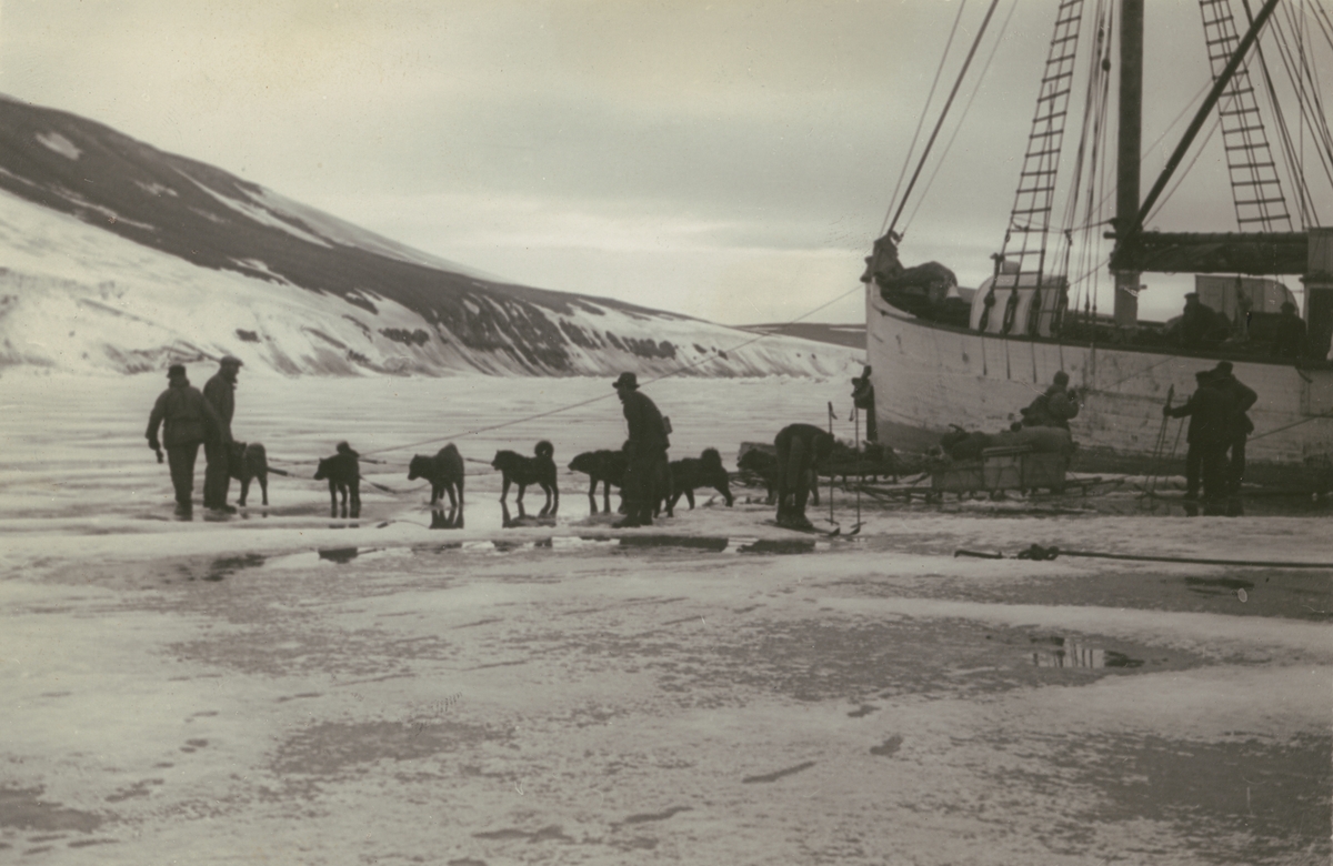 Fotografi från Ahlmannexpeditionen 1931. Motiv av män och hundspann vid fartyg redo att bege sig ut på expedition över inlandsisen.