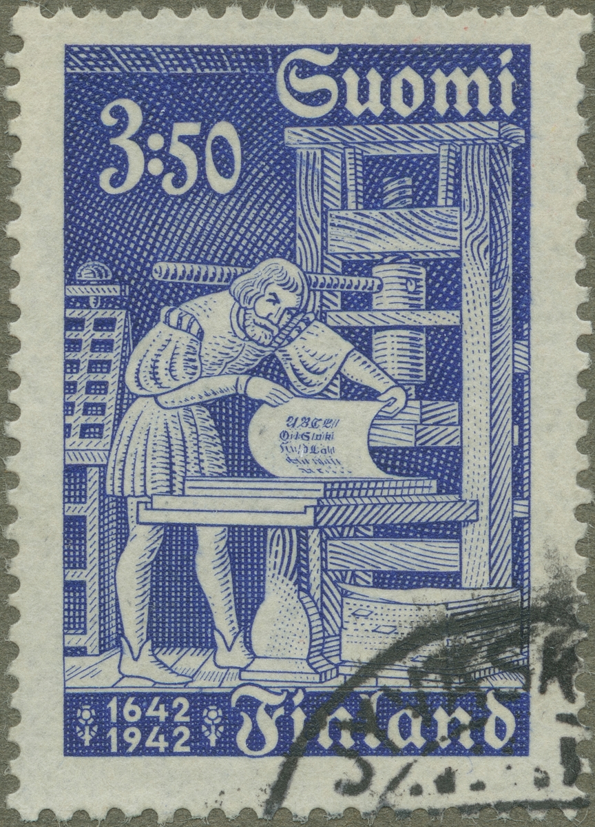 Frimärke från Finland, 1942. Motiv av Handtryckpress från 1600-talet. 300-årsjubileum av Finlands första boktryckeri: 1642-1942.