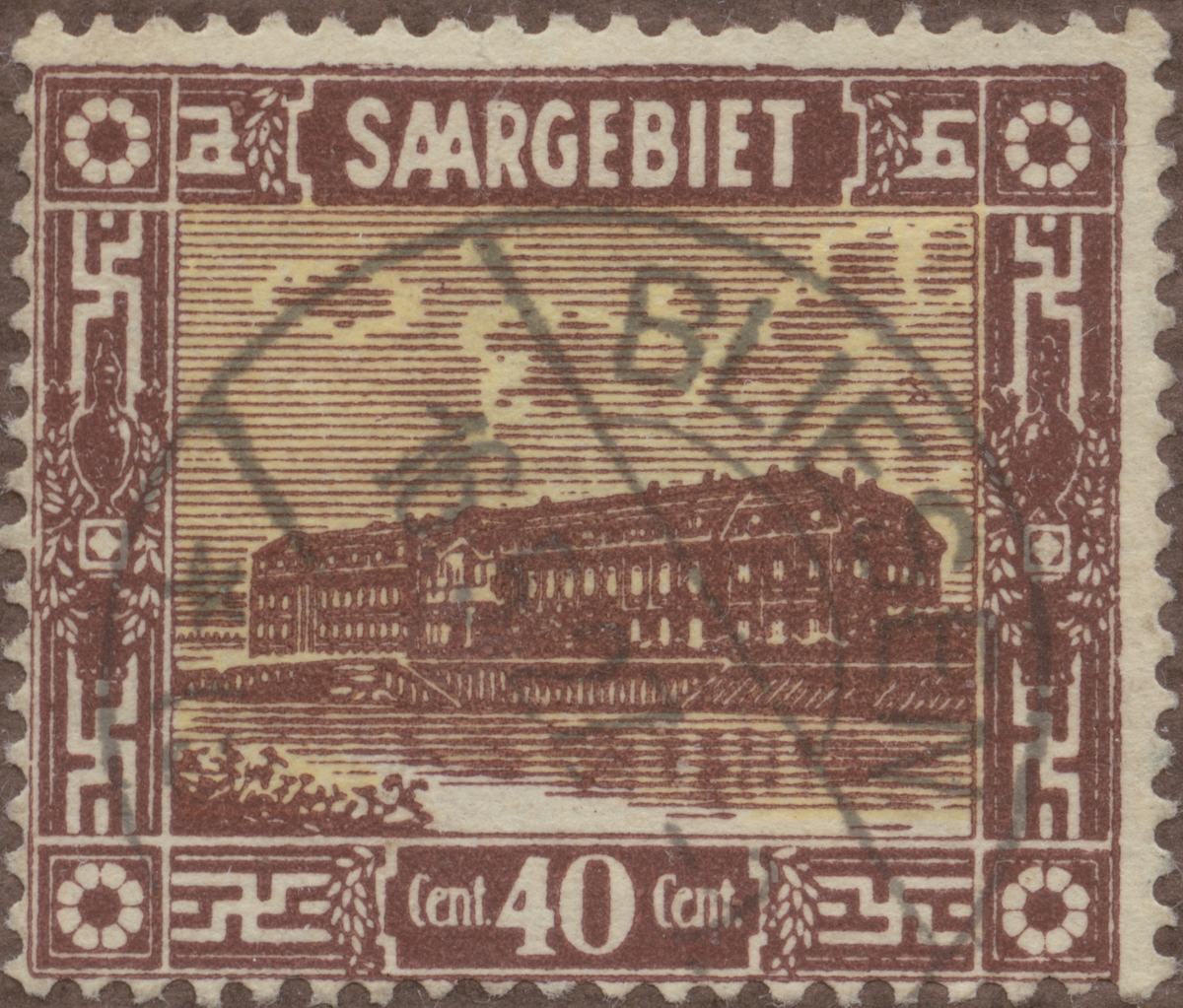 Frimärke från Saar, 1921. Motiv från fajansfabriken i Mettlach, Saar.
