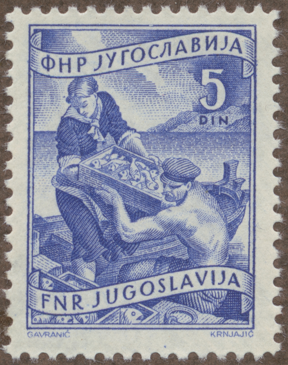 Frimärke från Jugoslavien, 1950. Motiv av Jugoslavisk låda med fisk