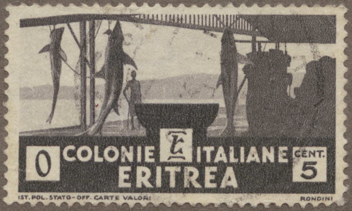 Frimärke från Eritrea, 1934. Motiv av Fångst av tonfisk eller hajar vid Eritreas kust, Röda havet.