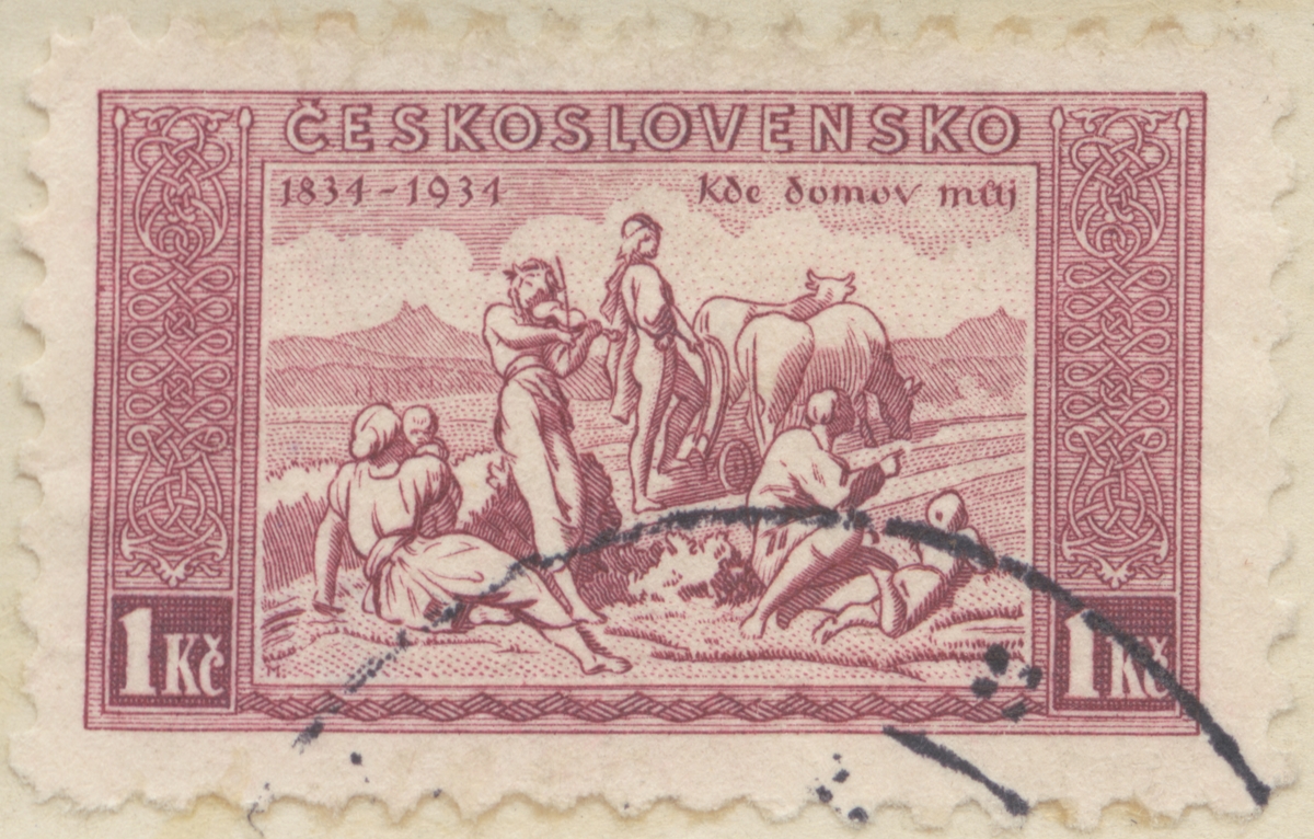 Frimärke från Tjeckoslovakien, 1934. Motiv av "Vart är mitt hem?" -Tjeckoslovakiens nationalhymn: 100 år: 1834-1934.