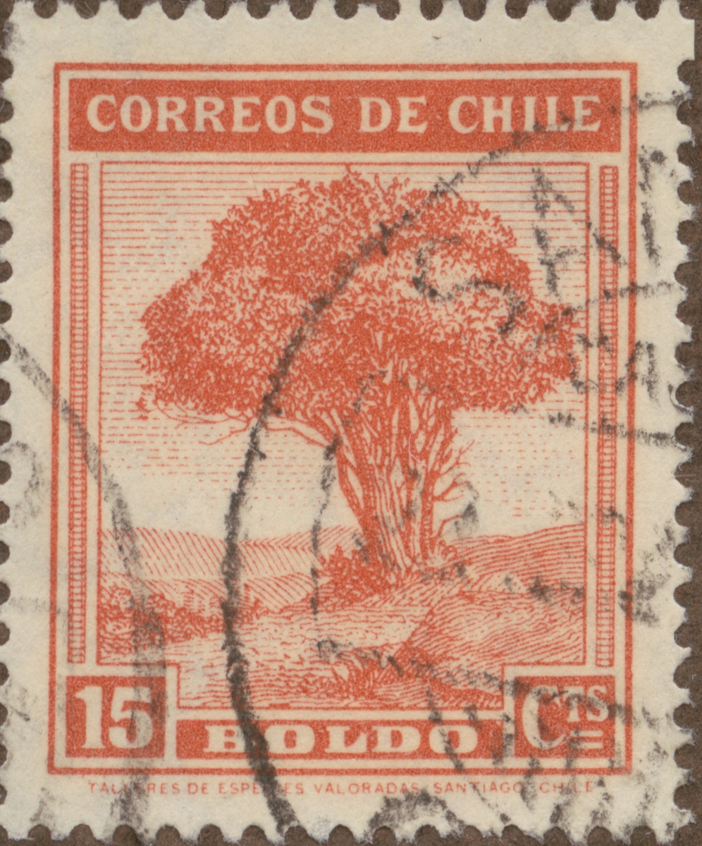 Frimärke från Chile, 1940. Motiv av Boldoträd vid Santiago.