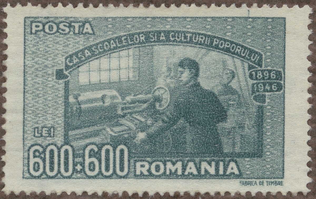 Frimärke från Rumänien, 1947. Motiv av Undervisning i verkstadsarbete -Propaganda för folkupplysning-