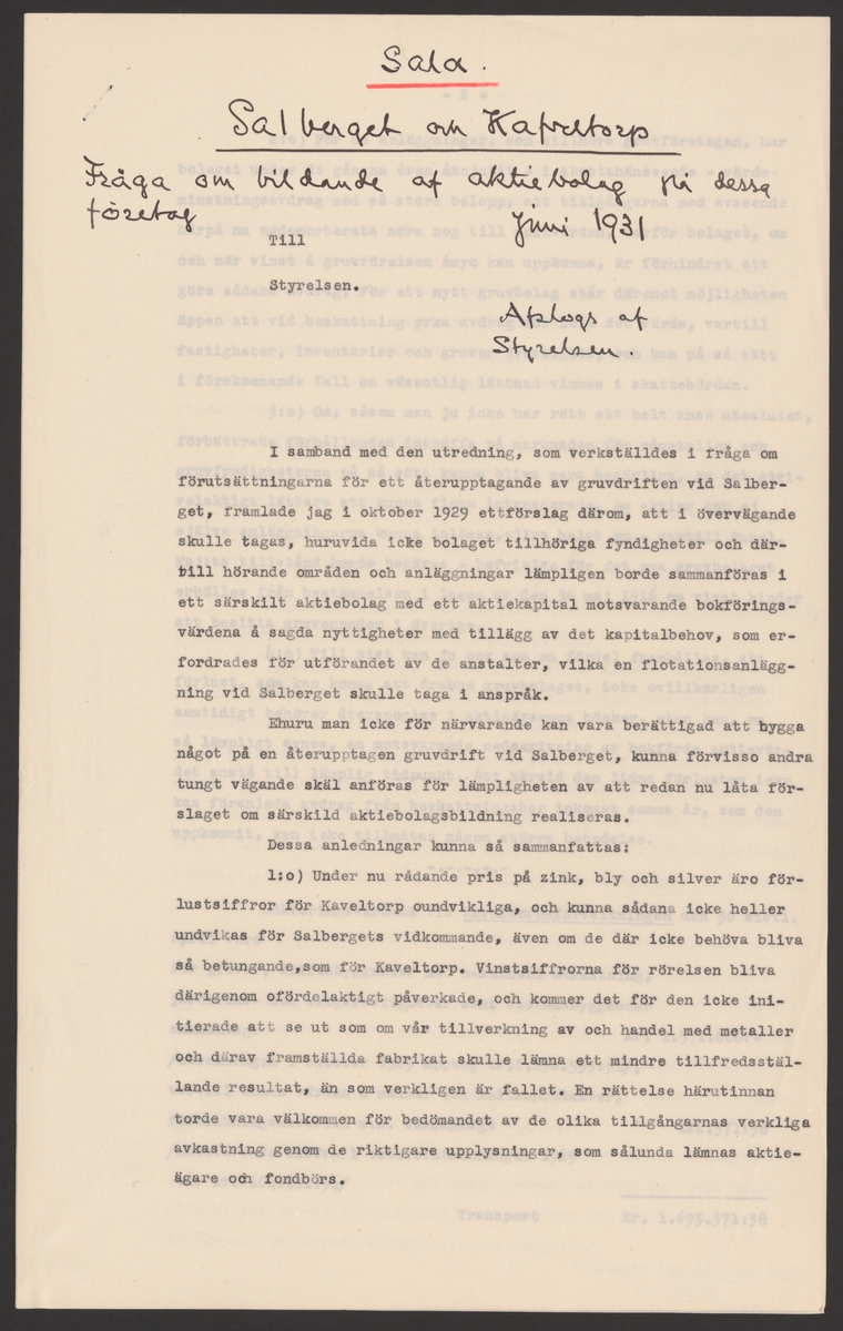 Titel: Sala gruva och silververks kronologi. Sala Silvergruva. Ur Carl Sahlins bergshistoriska samling.