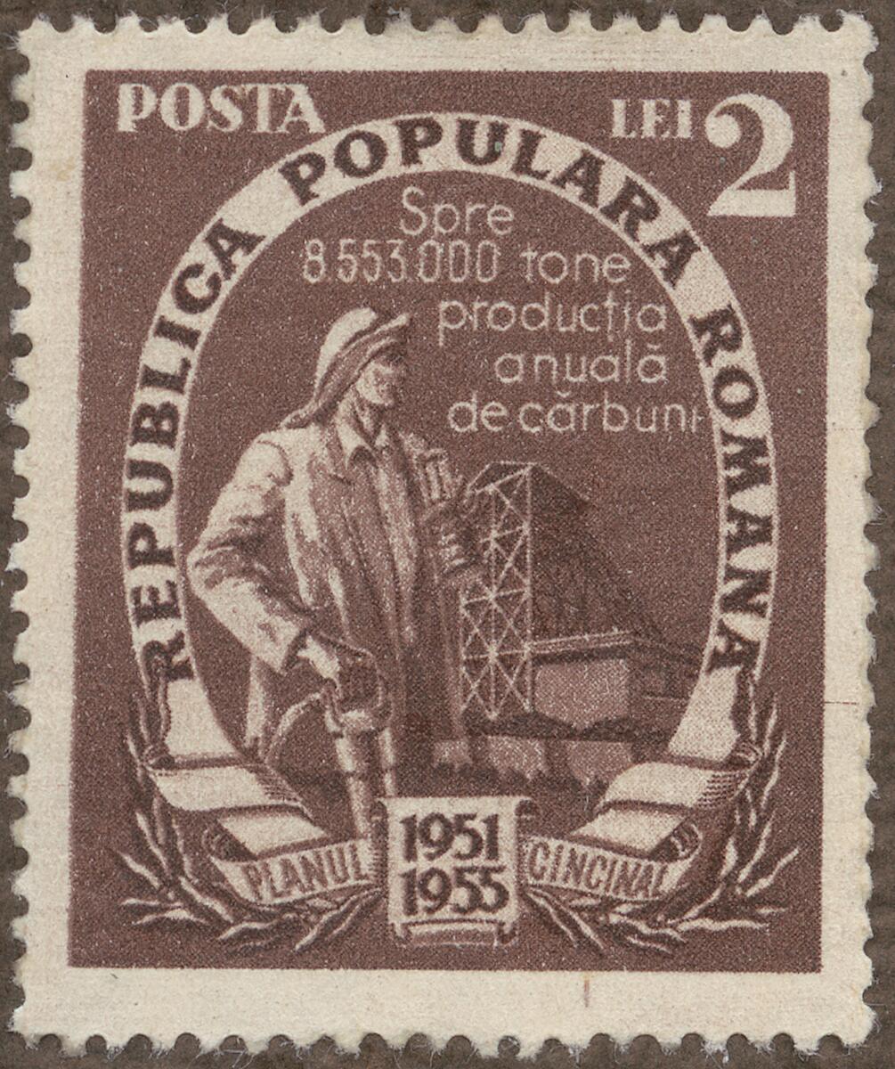 Frimärke från Rumänien, 1951. Motiv av Kolgruv-arbetare med borr och gruvlampa Gruvlave Siffror för femårsplan 1951-1955