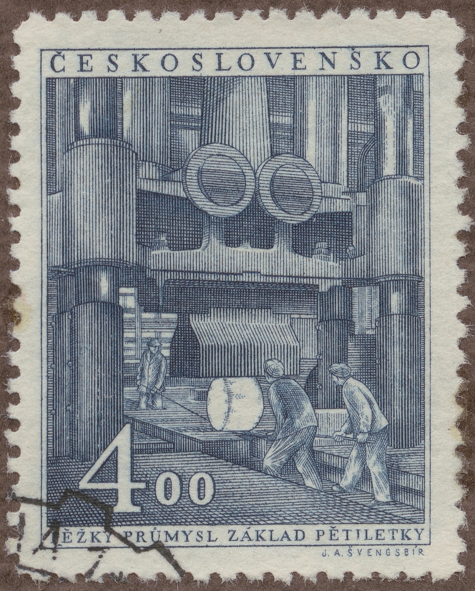 Frimärke från Tscheckoslovakiet, 1951. Hydraulisk stor smideshammare