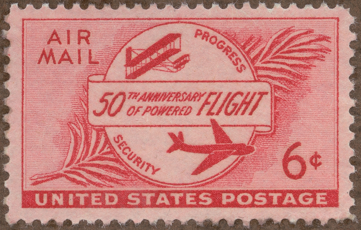 Frimärke från U.S.A., 1953. Motiv av Monoplan och biplan "(inskription): "Progress: Security. 50th anniversay of powered flight""- 50-årsminne av motorflyg 1903-1953. Luftpostmärke.
