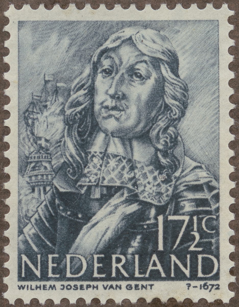 Frimärke från Nederländerna, 1943. Motiv av Wilhelm Joseph van Gent ?-1672 Holländsk amiral. Aktern av en fullriggare synes i bakgrunden