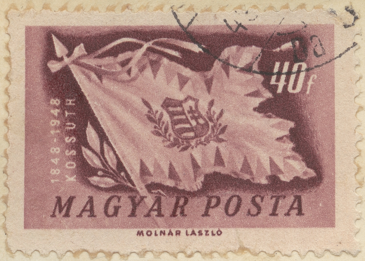Frimärke från Ungern, 1948. Motiv av Nationalflagga med vapen 100-årsminne av 1848 revolten vid frihetshjälten Lajoz Kossuth f. 1802 d. 1894.