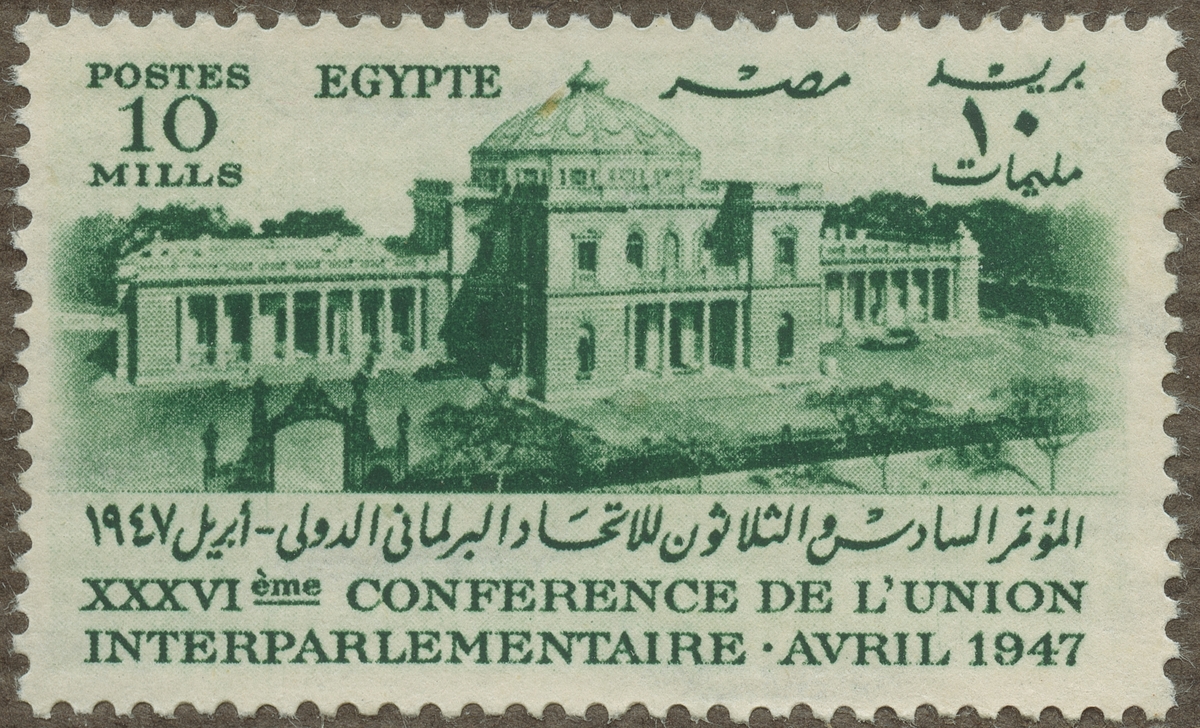 Frimärke från Egypten, 1947. Motiv av Kongressbyggnad 36-te Interparlamentariska konferensen 1947