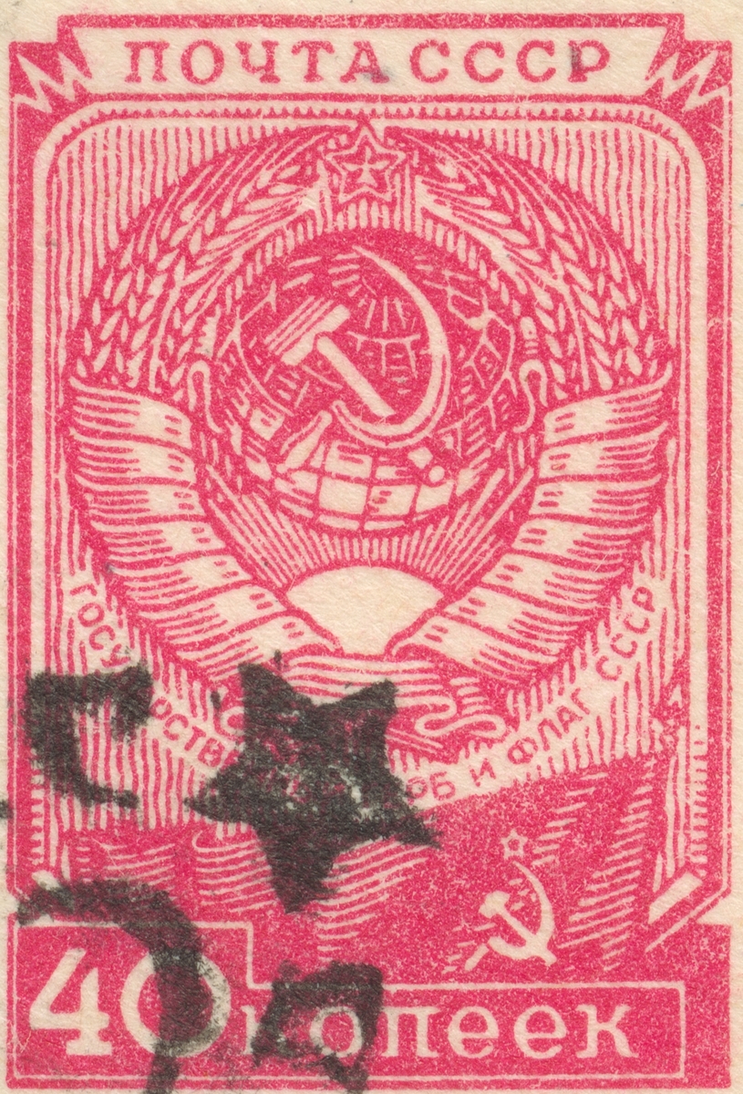 Frimärke från Ryssland, 1957. Motiv av Coat of Arms för USSR, 7 band på varje sida och ett i mitten för de 15 Sovjetrepublikerna (från 1957 och frammåt). På "Förstadagsbrev" med TEKA 0221272.