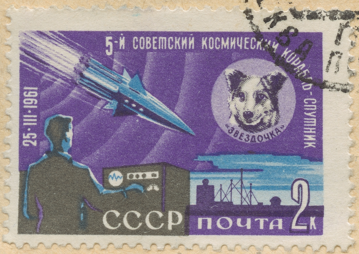 Frimärke från Ryssland, 1961. Motiv av Sputnik 10 och Zvezdochka" hund. 5-te Sovjetiska rymdfarkosten i omloppsbana runt jorden 25 mars 1961. "Förstadagsbrev" med TEKA 0221275.