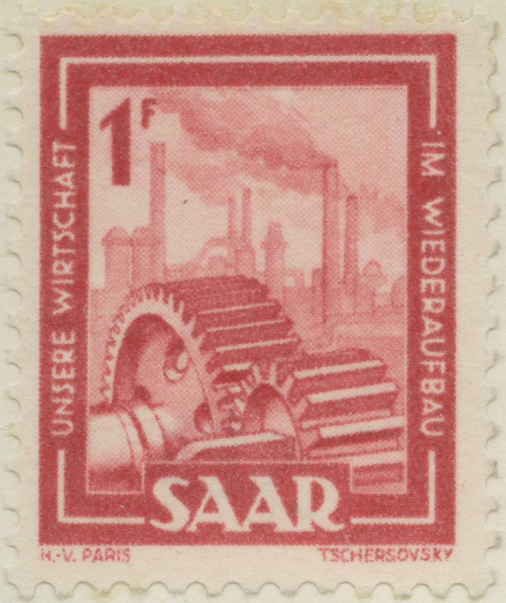 Frimärke ur Gösta Bodmans filatelistiska motivsamling, påbörjad 1950. Frimärke från Saar, 1949. Motiv av "Symboler - Maskin Industri -"