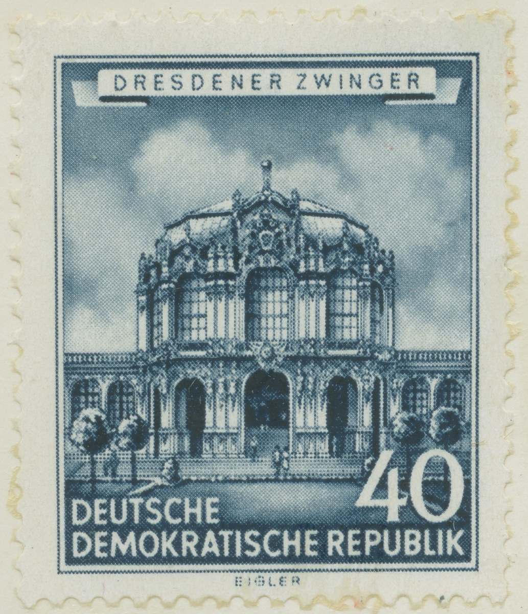 Frimärke från Östtyskland, 1955. Motiv av rekonstruktion av Zwinger rokokopalats i Dresden. "Uppf. 1711-1722. Svårt skadat under andra världskriget 1940-1945".