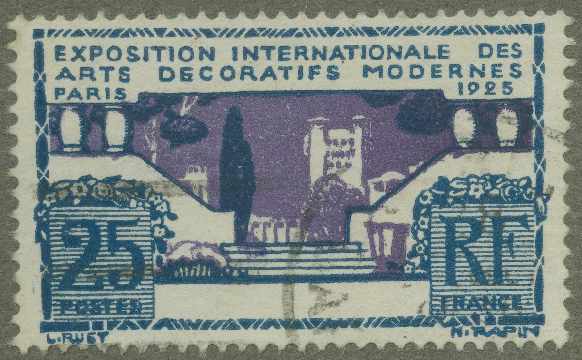Frimärke från Frankrike, 1925. Motiv av symbol för byggnadskonsten. "Internationella utställningen för modern, dekorativ konst i Paris, 1925".
