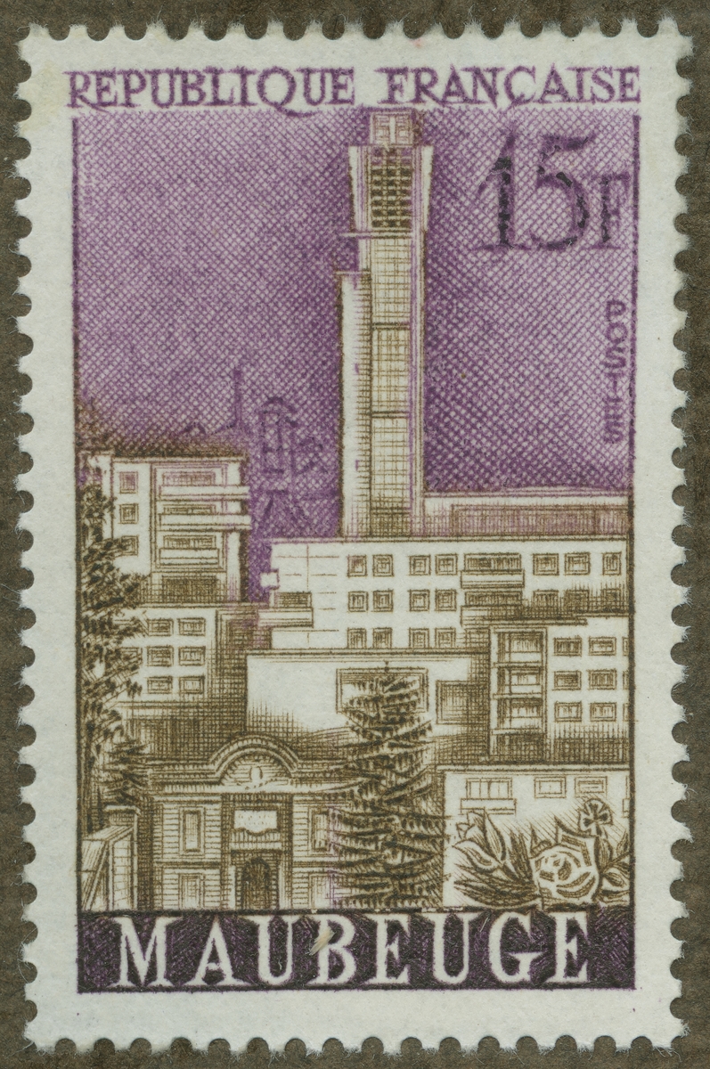 Frimärke från Frankrike, 1958. Motiv av höghusbebyggelse i Maubeuge.