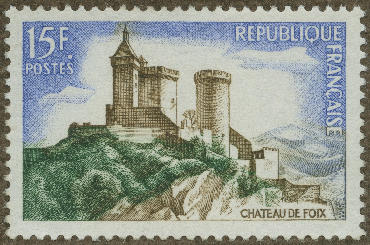 Frimärke ur Gösta Bodmans filatelistiska motivsamling, påbörjad 1950. Frimärke från Frankrike, 1959. Motiv av Slott i bergslandskap: "Chateau de Foix"