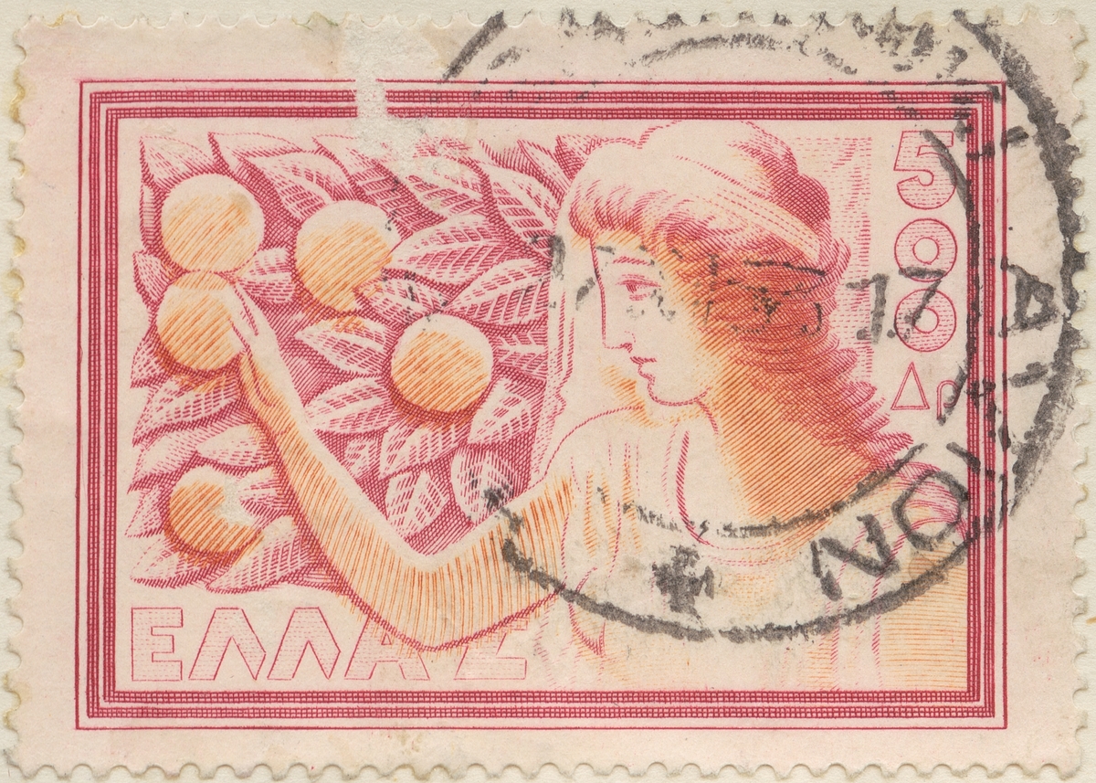 Frimärke från Grekland, 1953. Motiv av flicka med apelsiner. "Serie: grekiska lantbruksprodukter".