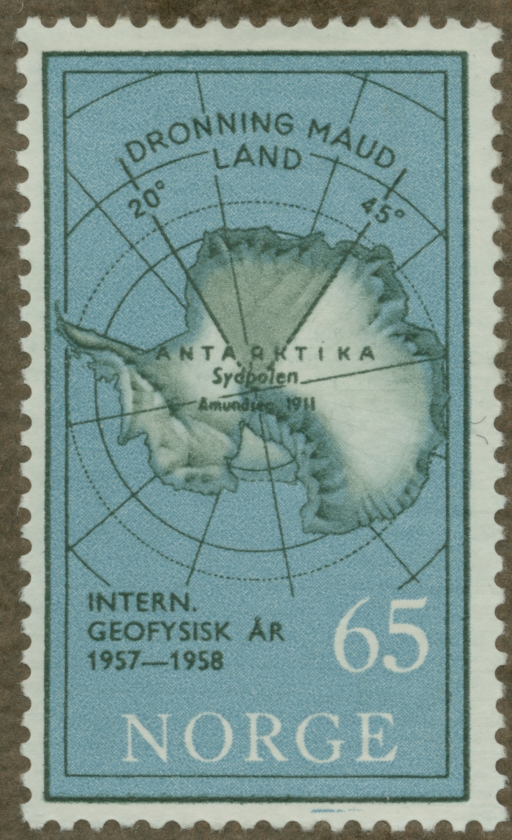 Frimärke från Norge, 1957. Motiv av karta över Antarctis med Norges landsordran: Drottning Mauds Land. "Internationella Geofysiska Året: 1957-1958".