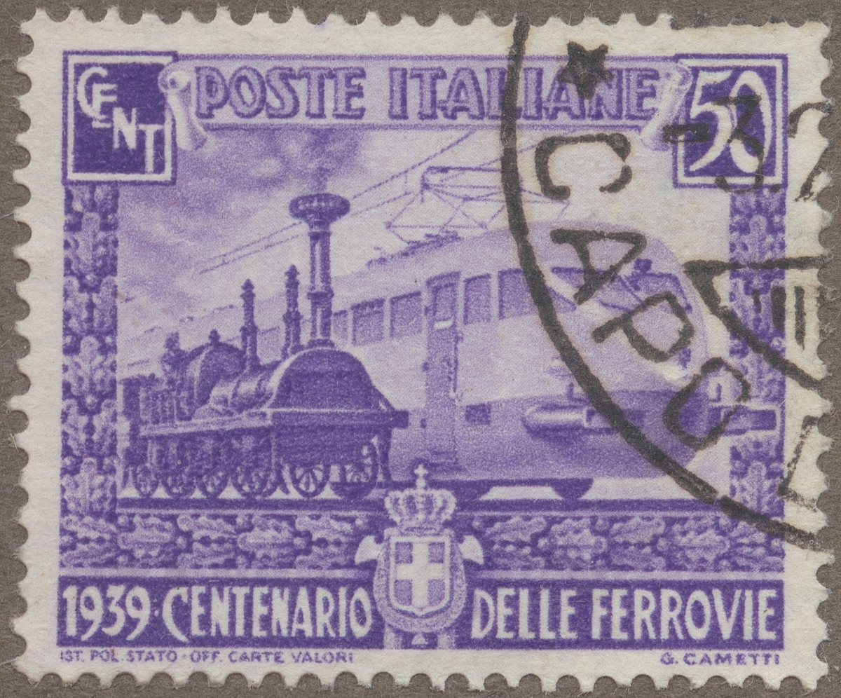 Frimärken ur Gösta Bodmans filatelistiska motivsamling, påbörjad 1950. Frimärke från Italien, 1939. Motiv av "Italienskt ånglokomotiv från 1839 och el.-lok. från 1939." "100-årsminne av de italienska järnvägarna. 1839-1939."