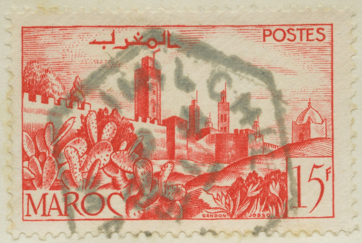Frimärke från Franska Marocko, 1949. Motiv av Staden Casablancas befästningsvallar, "Ramparte"