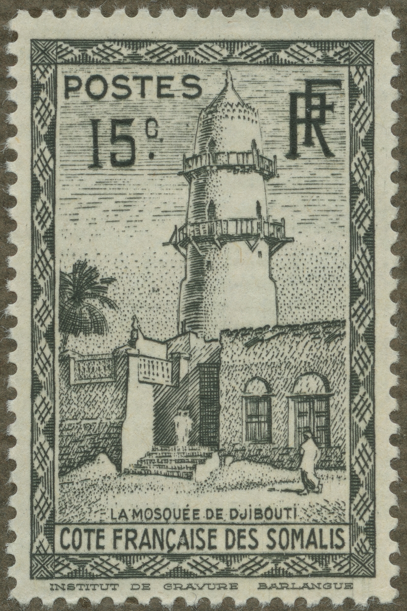 Frimärke från Fr. Somaliland, 1938. Motiv av moskéen i Djibouti. "Franska Somaliland, östligaste spetsen av Afrika.