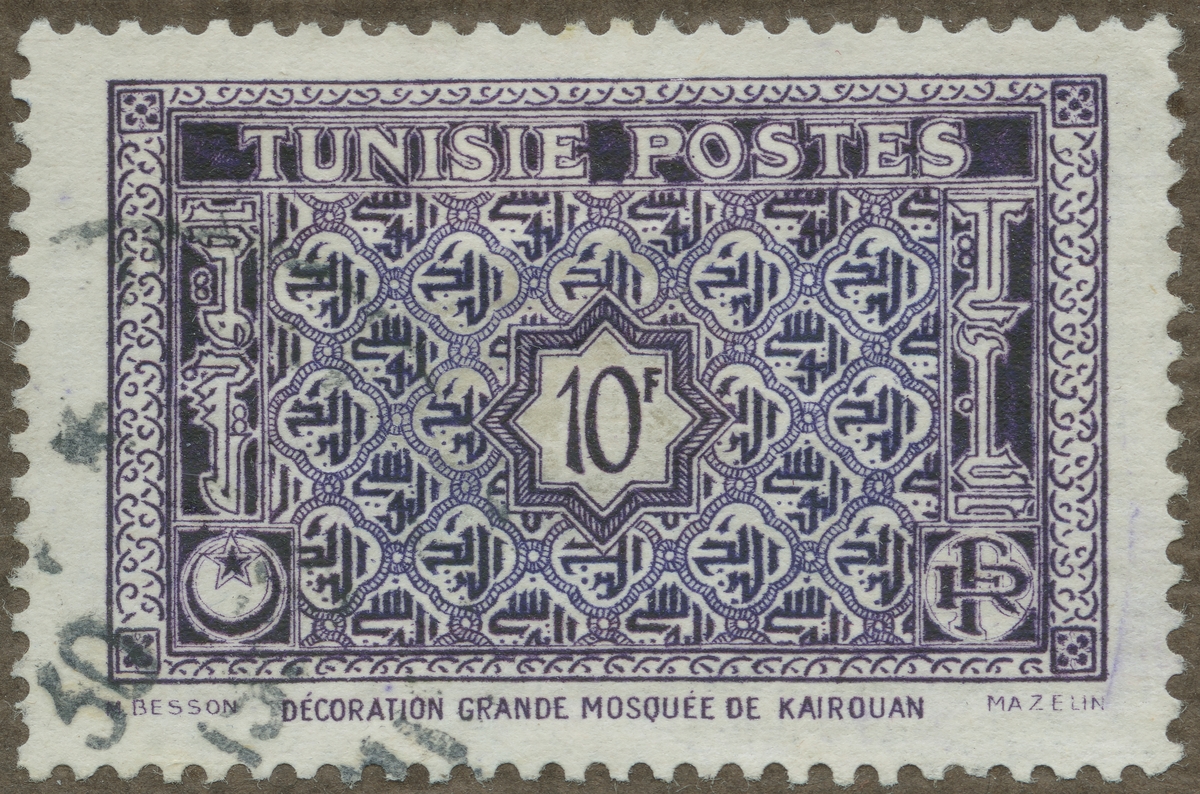 Frimärke från Tunisien, 1949. Motiv av dekorationsmedalj från Stora Moskén i Kairouan.