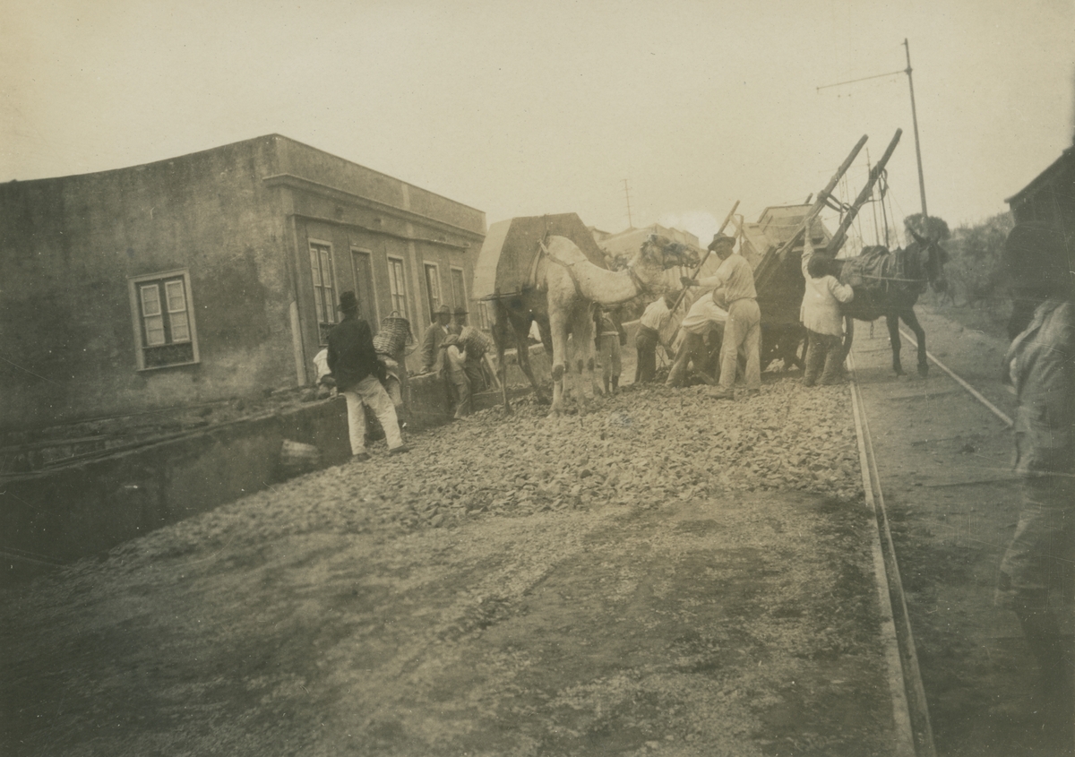 Fotografi från expedition till Peru 1920. Motiv av ett antal personer på stenig väg bredvid stenhus. De har en kamel och en häst med vagn.