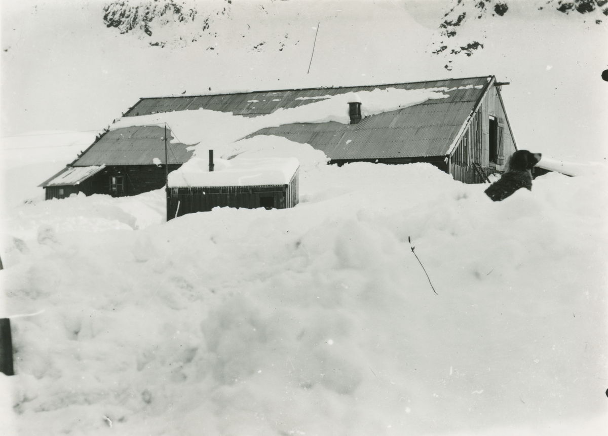 Bild från expedition i Antarktisområdet. Motiv av insnöat hus.