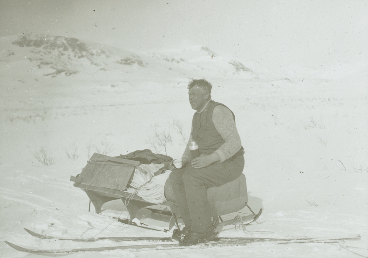 Fotografi från expedition till Spetsbergen. Motiv av man som dricker kaffe i snölandskap.