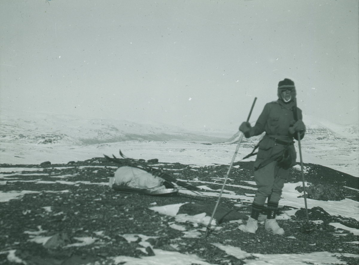 Fotografi från expedition till Spetsbergen. Motiv av kvinna i snötäckt bergslandskap.