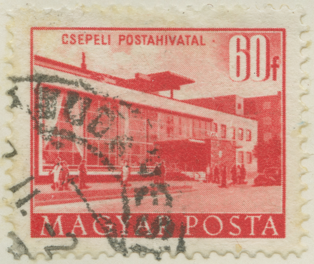 Frimärke från Ungern, 1953. Motiv av Postbyggnad i Csepeli