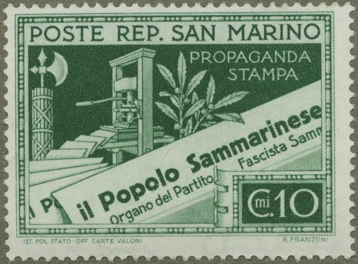 Frimärke från San Marino, 1943. Motiv av Gammal boktryckarpress och modern tidning