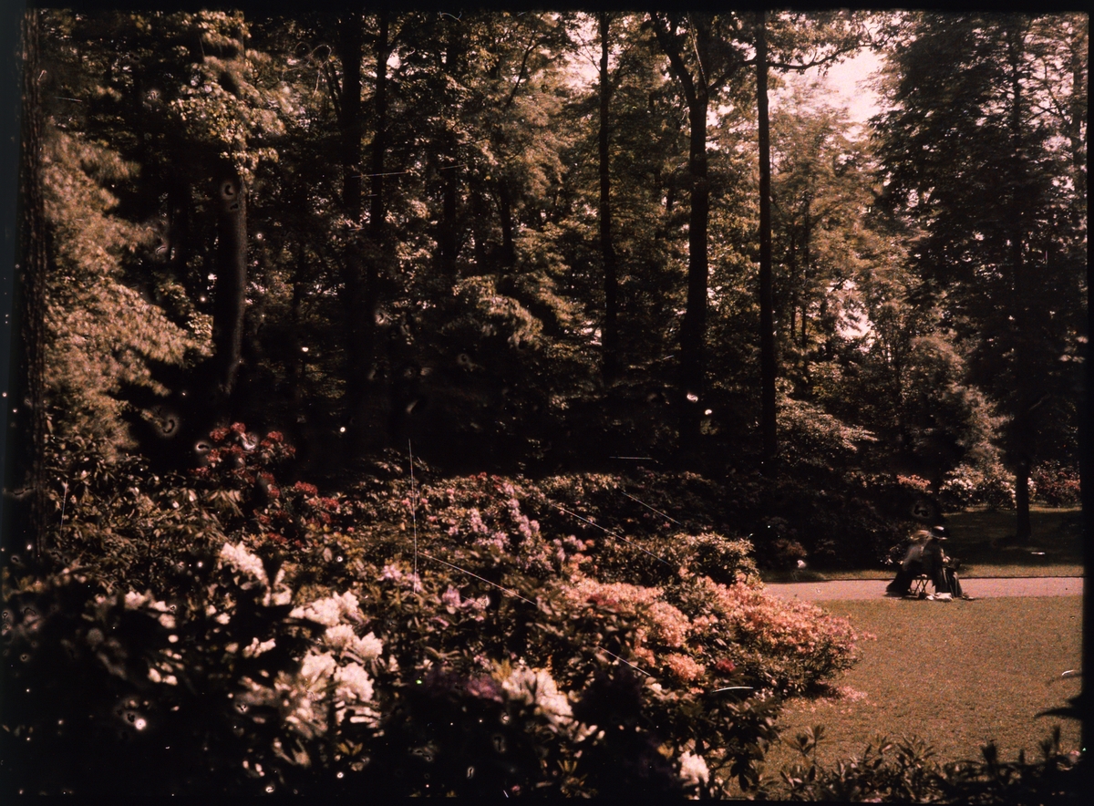 Lumières-autokrom. Stor trädgårdsodling av rododendron i Dresden. Fotograferad i maj 1910 kl 10.30 med f/48, 105 sek. exponering.
