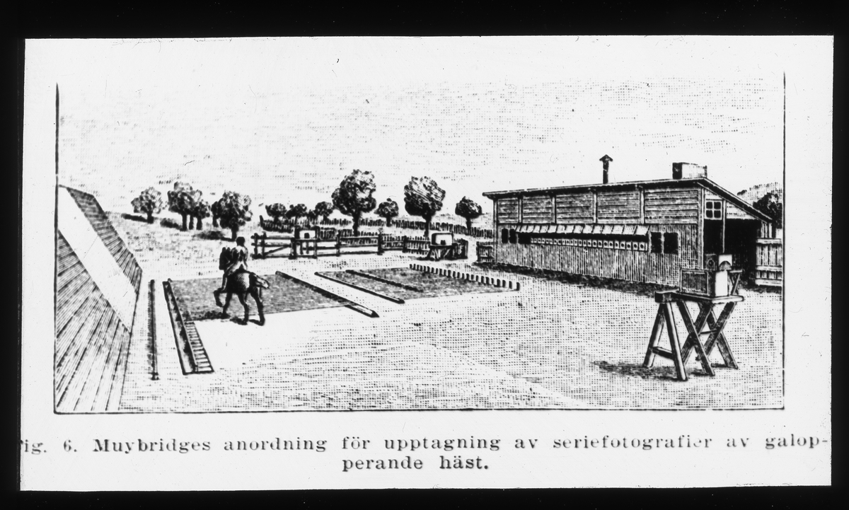 Muybridges anordning för upptagning av seriefotografier av galopperande häst med 24 kameror, som succesivt utlöstes.