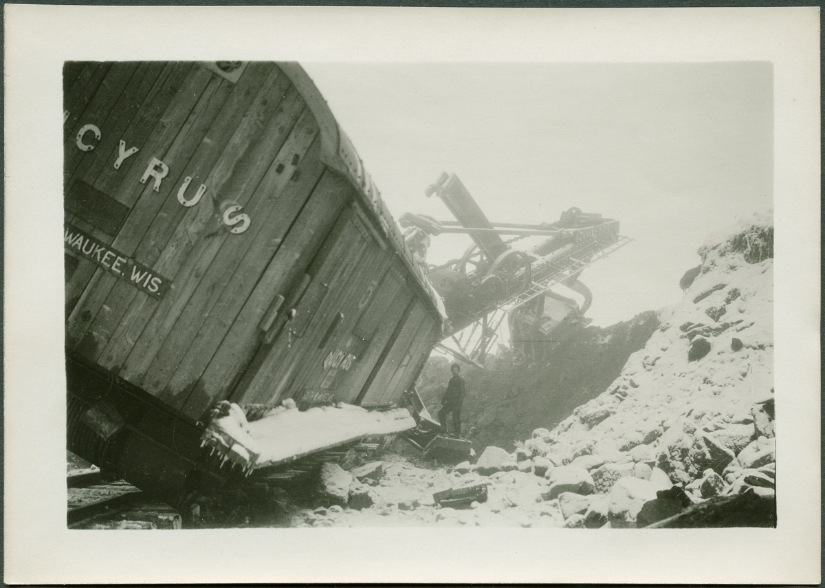 Grävskopa med lyftkran på lut vid gruvan i Kiruna. På bildens baksida står det Gustaf Horn.