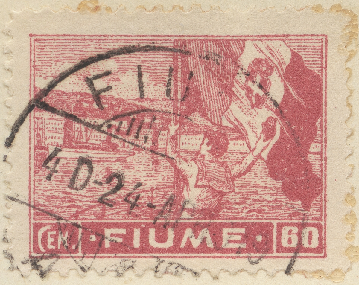 Frimärke från Fiume, 1919. Motiv av Italiens flagga på skepp i Fiumes Hamn 1918.