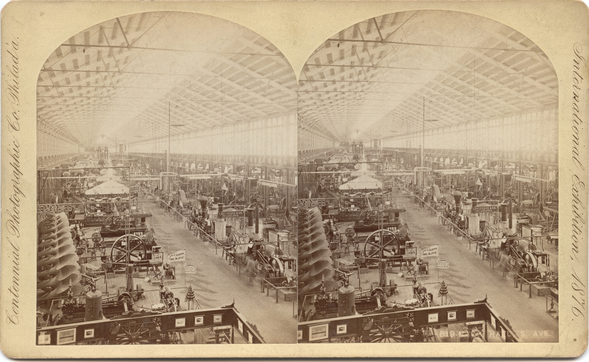 Stereobild med motiv av maskinhallen i Världsutställningen i Philadelphia 1876.