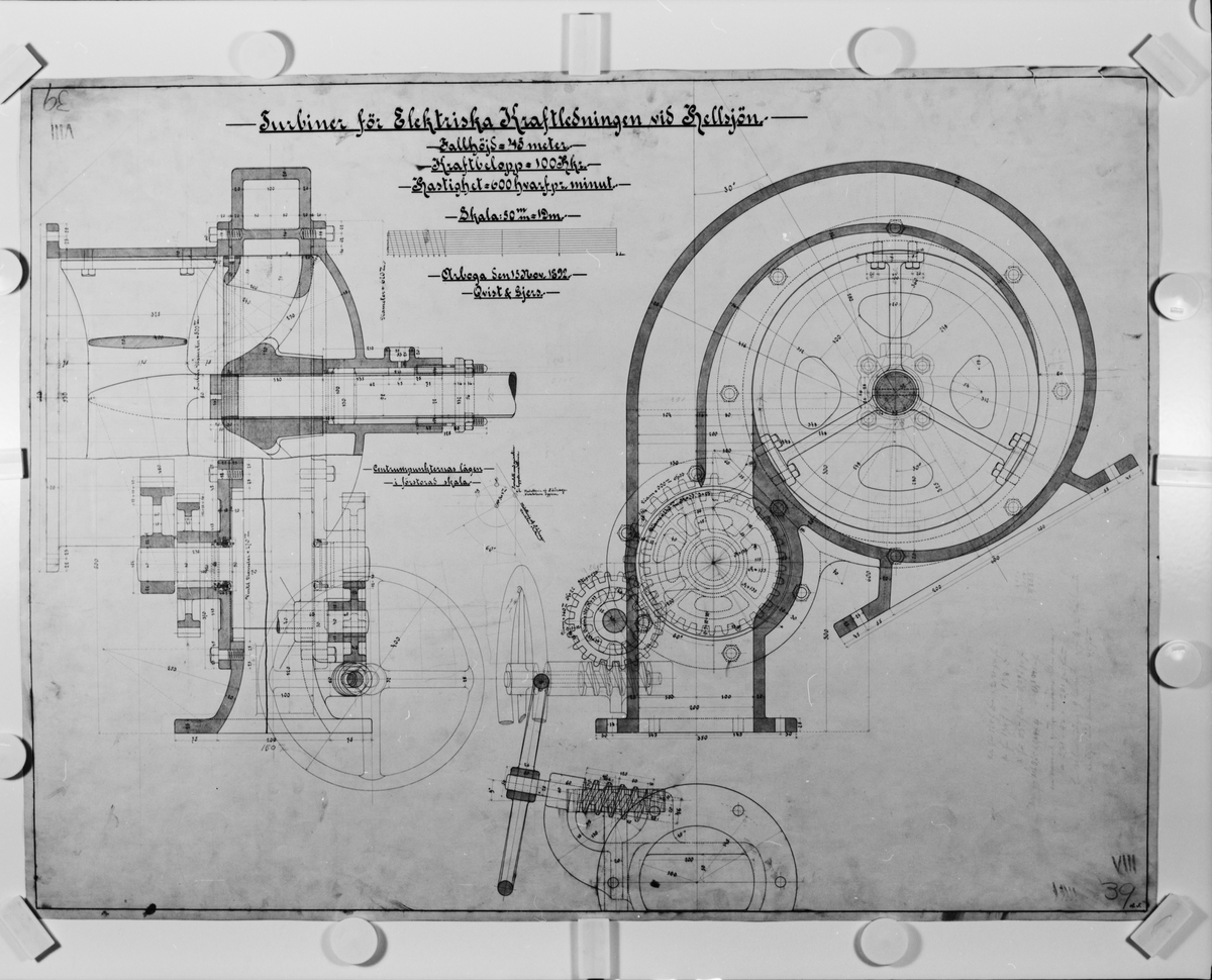 Ritning till turbiner för elektriska kraftledningen vid Hellsjö kraftstation.