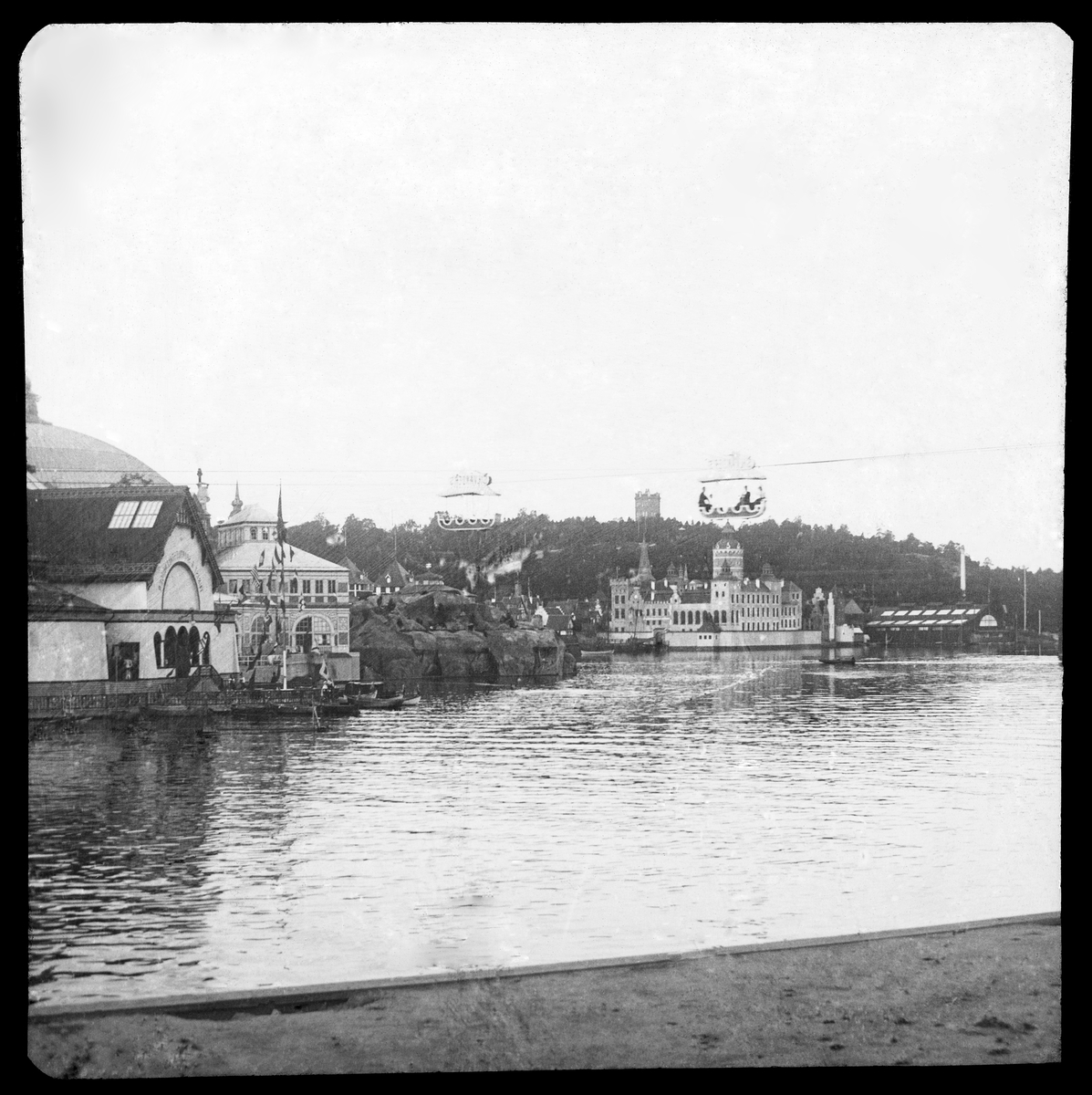 Skioptikonbild med motiv från Allmänna Konst- och Industriutställningen i Stockholm 1897. Linbanan.