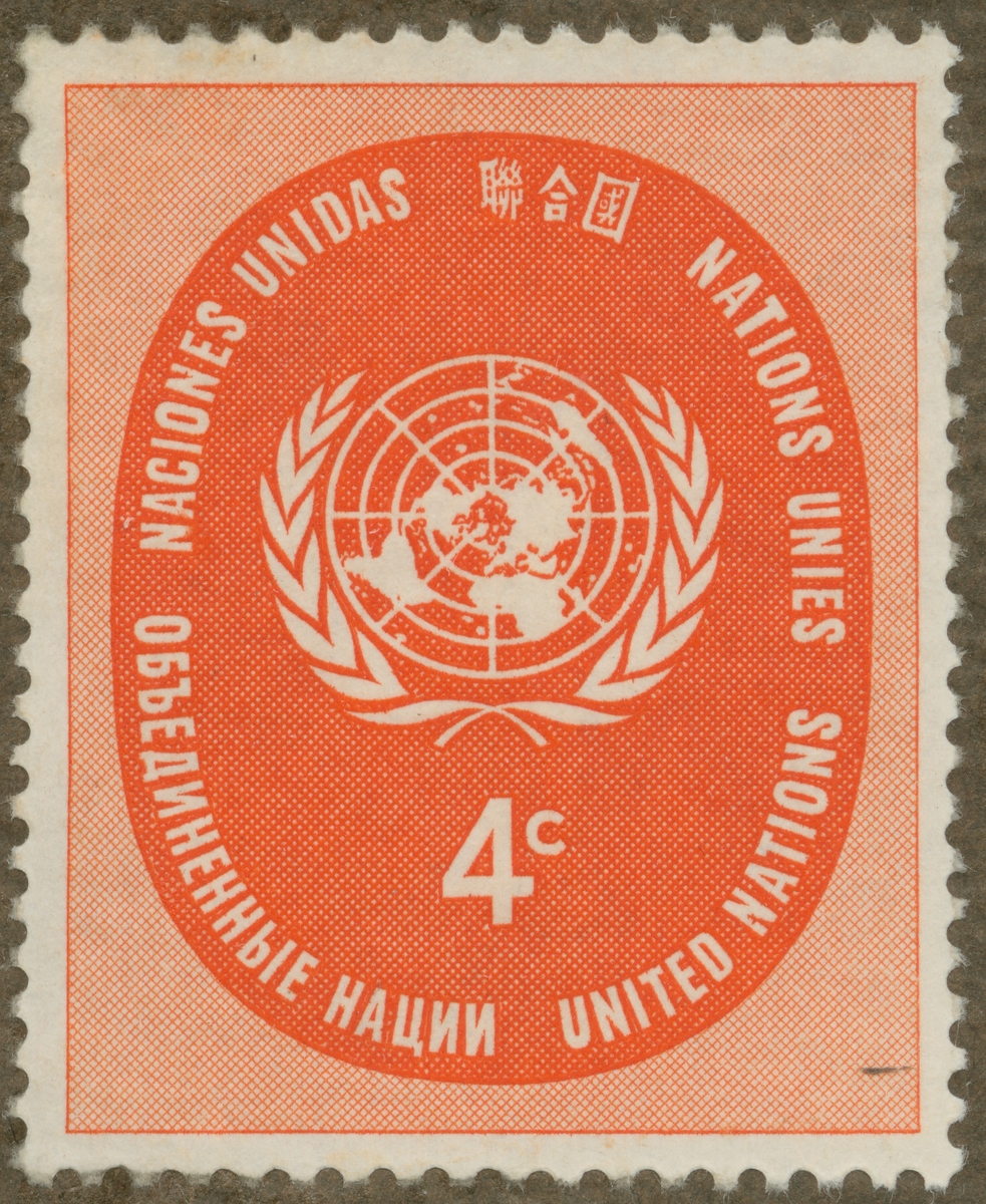 Frimärke från Nations Unies 1958. Motiv av F. N.- märket.