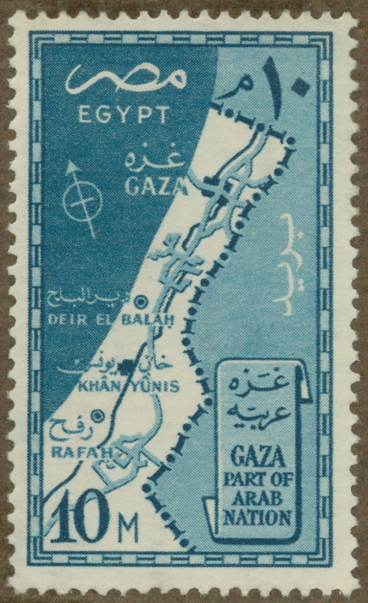 Frimärke från Egypten, 1958. Motiv av detaljkarta över Gaza. Inskrift: "Gaza - part of Arab nation".