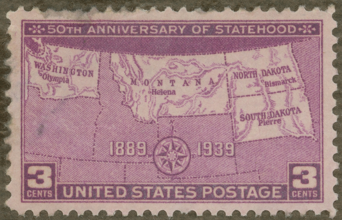 Frimärke från USA, 1939. Motiv av karta över staterna North Dakota och South Dakota. "50-år som stater 1889".