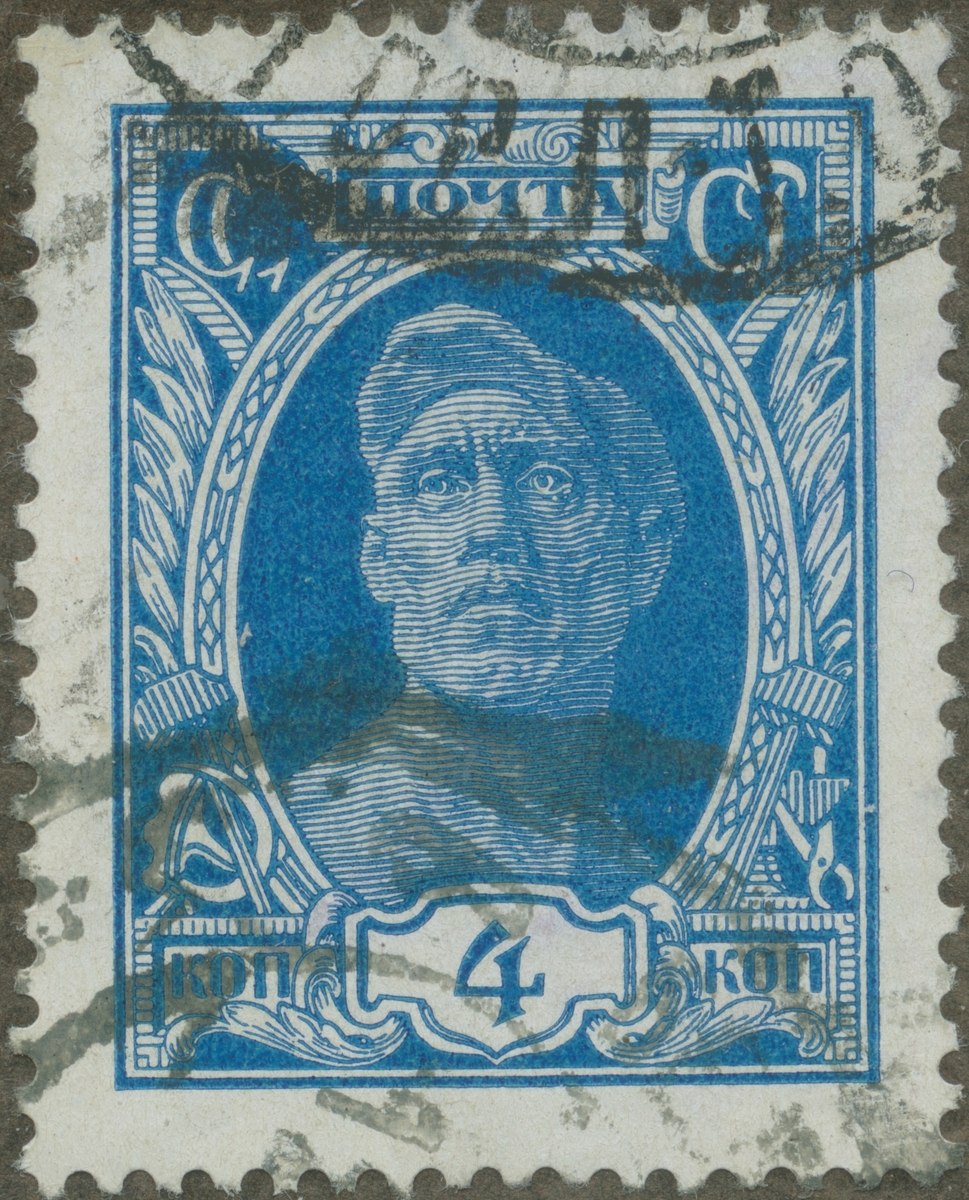 Frimärke ur Gösta Bodmans filatelistiska motivsamling, påbörjad 1950. Frimärke från Ryssland, 1927. Motiv av "Rysk arbetaretyp"