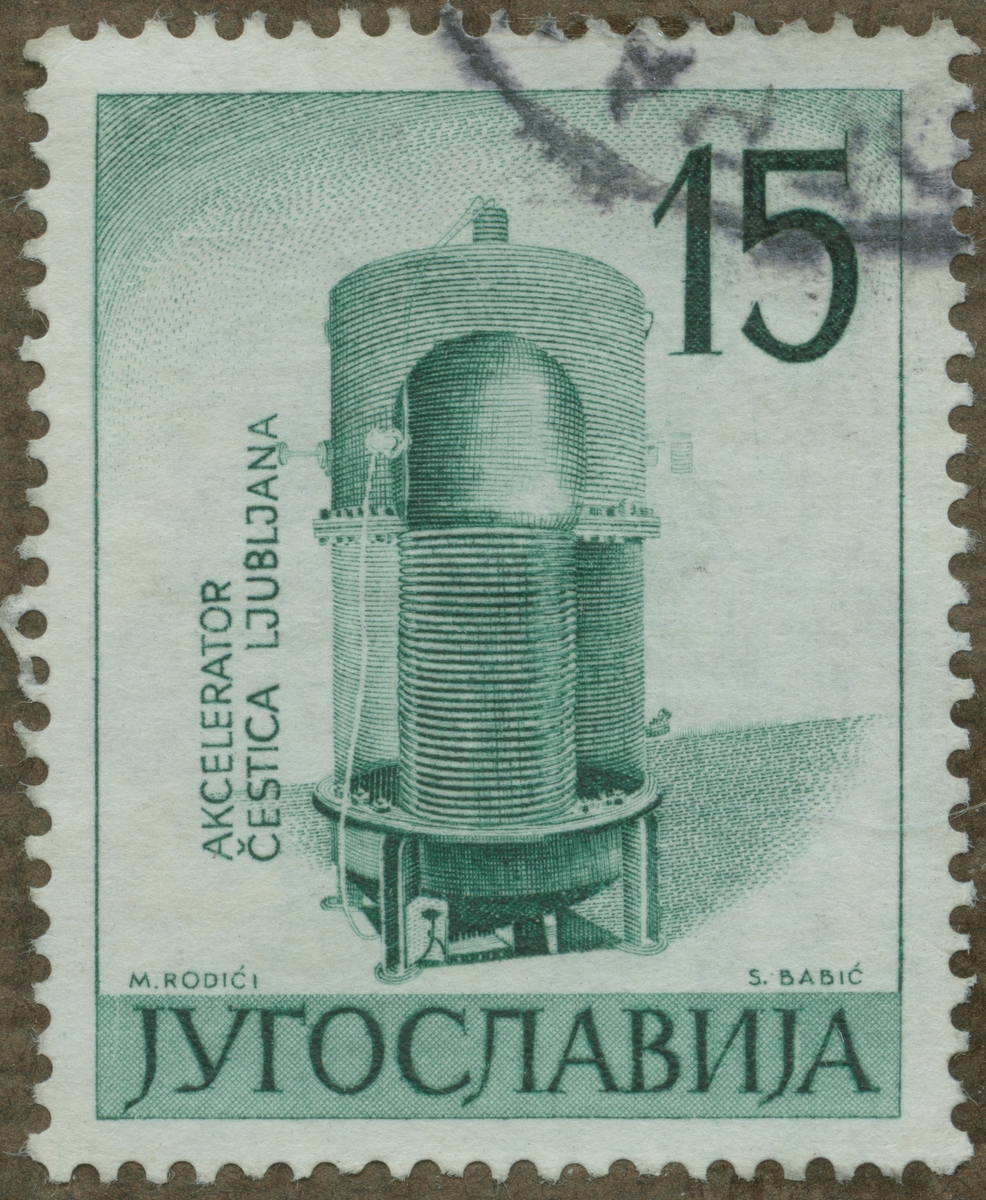 Frimärke ur Gösta Bodmans filatelistiska motivsamling, påbörjad 1950. Frimärke från Jugoslavien, 1961. Motiv av Atom- och kärnfysik: Accelerator Cestica Ljubljana