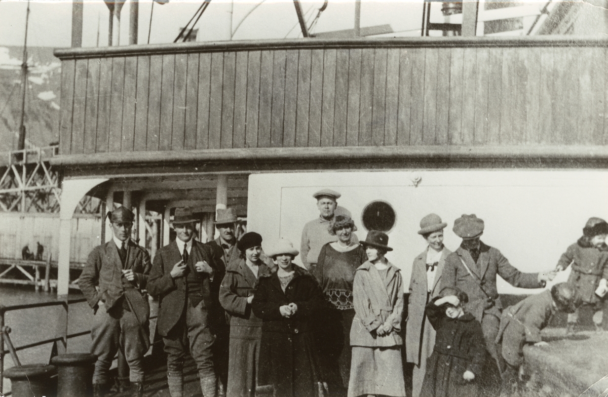 Fotografi från expedition till Spetsbergen 1918-1919. Motiv av en grupp män och kvinnor och barn som poserar på en kaj.