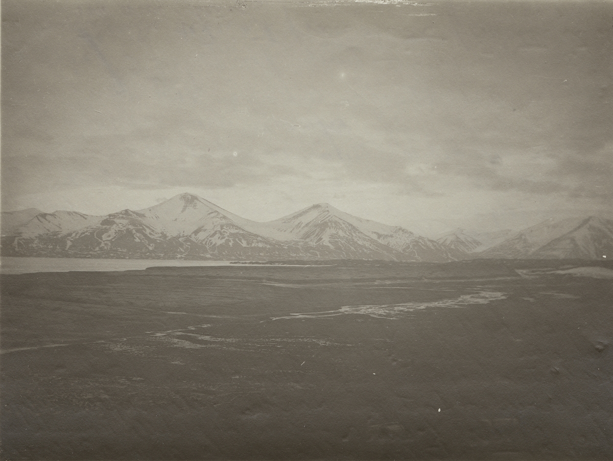 Fotografi från expedition till Spetsbergen. Vy över kargt landskap med snötäckta berg i bakgrunden.